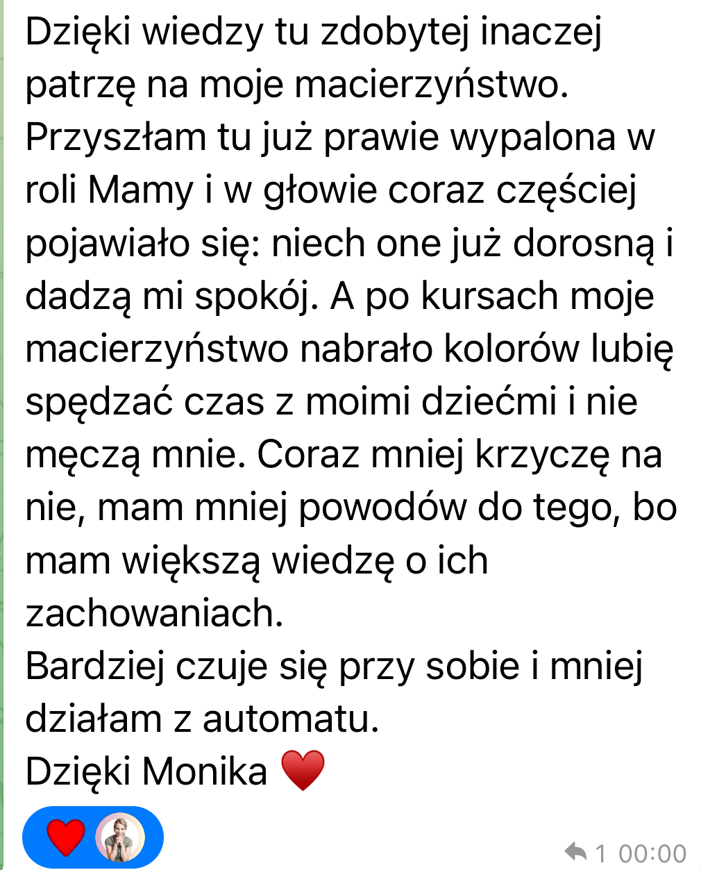 Setki mam skorzystały z tych narzędzi, zatrzymały krzyk i niekontrolowane wybuchy złości, odzyskały spokój oraz satysfakcję z bycia mamą, a agresja ich dzieci realnie się wyciszyła.
