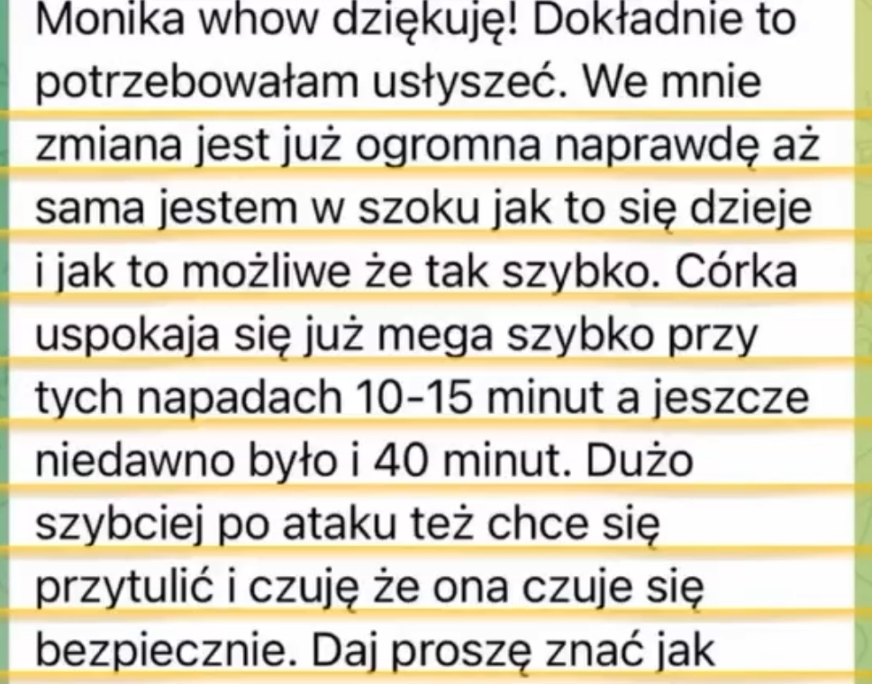 To esencja moich najskuteczniejszych programów — w jednej metodzie, która zatrzymuje krzyk. Regulujesz ciało. Zatrzymujesz wybuch. Odzyskujesz kontrolę. Pierwszą ulgę poczujesz już w pierwszym tygodniu. Mniej krzyku. Więcej spokoju. Dziecko zaczyna ufać.
