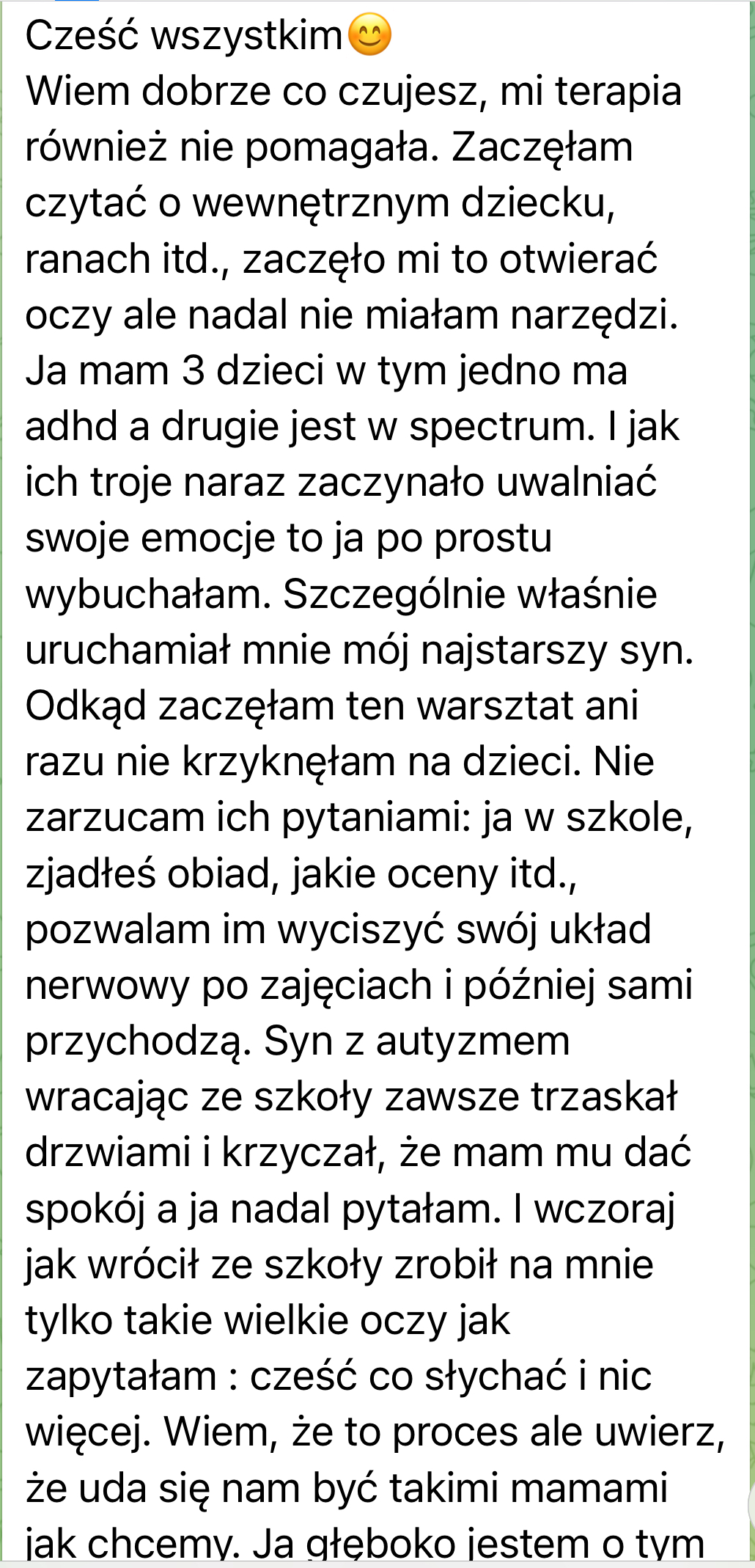 karach czy próbach kontroli dziecka. Jestem też mamą trójki dzieci, więc to, czego uczę, sprawdzam każdego dnia we własnym domu. Wiem, jak wygląda moment, w którym histeria dziecka wciąga Cię w wir krzyków i bezradności i wiem, jak go przerwać w kilka chwil, bez poczucia winy. Uczę rodziców:
