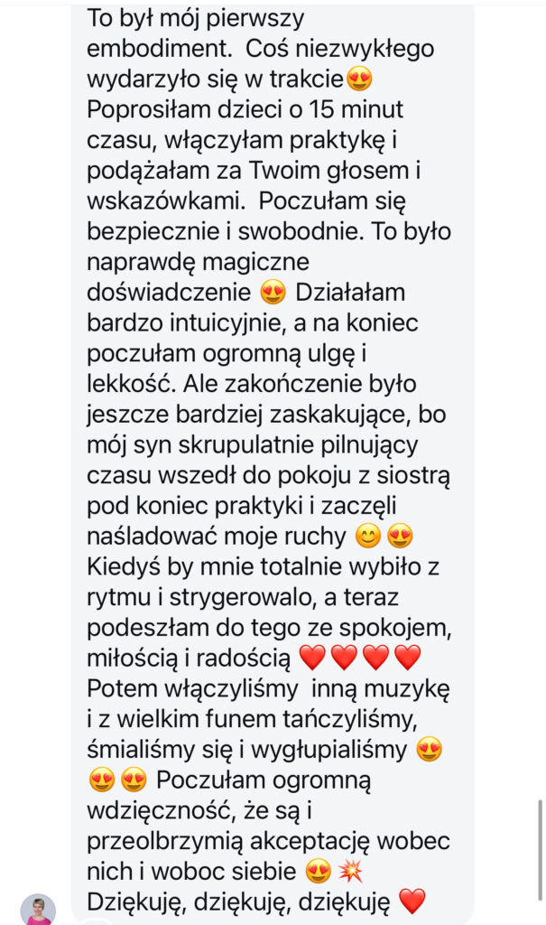 To nie jest zestaw „dobrych rad”. To jest podejście, które zmienia codzienność w domu od poranków bez awantur po wieczory bez wojen o bajki czy telefon. Uczę powrotu do siebie przez ciało, obecność i połączenie.