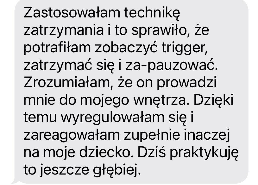 To nie znaczy, że trudne sytuacje z dzieckiem znikną. To znaczy, że one przestaną Cię powalać na kolana. One będą przychodzić, będziesz wybuchać – po to, żeby wstać i się podnieść. Bo to buduje w Tobie zasoby, żeby następnym razem łatwiej się zatrzymać. I z czasem te momenty stają się słabsze i mniej Ciebie odpalają.